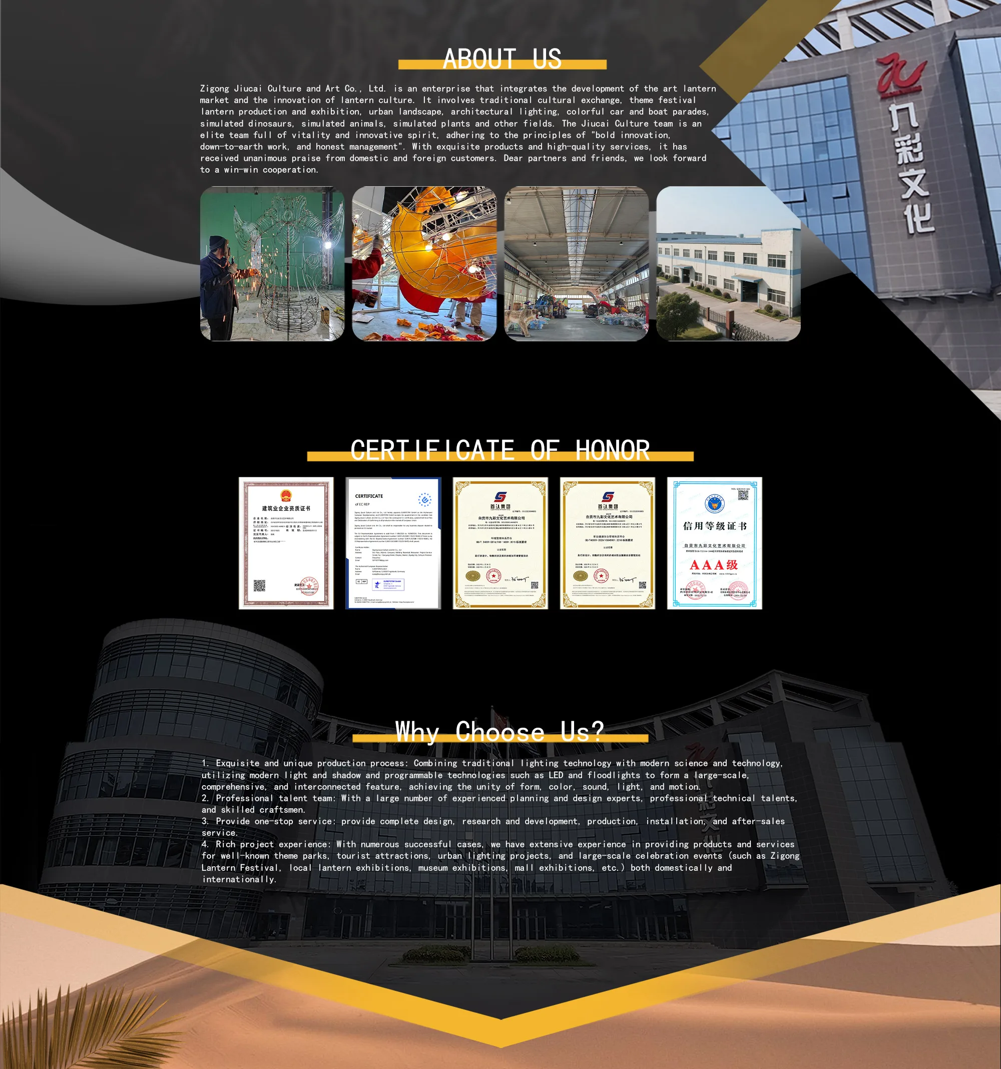 We can create various dinosaur models and artistic lights according to the needs of our customers.We are committed to producing environmentally friendly, safe, and high-quality products that are suitable for various indoor and outdoor display scenarios.If you have any ideas, please communicate with us promptly.
